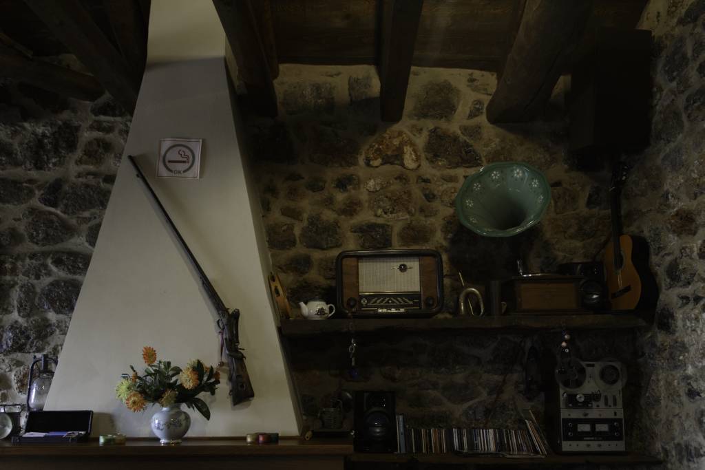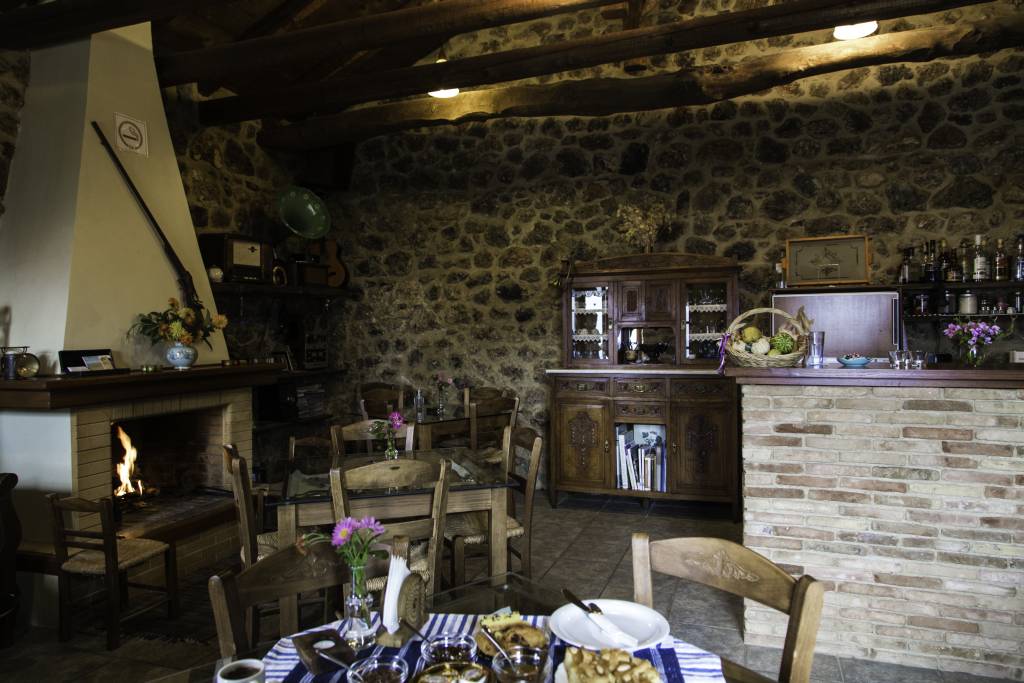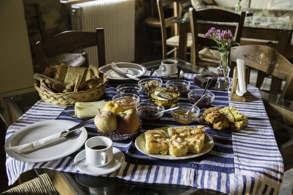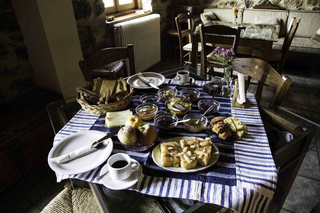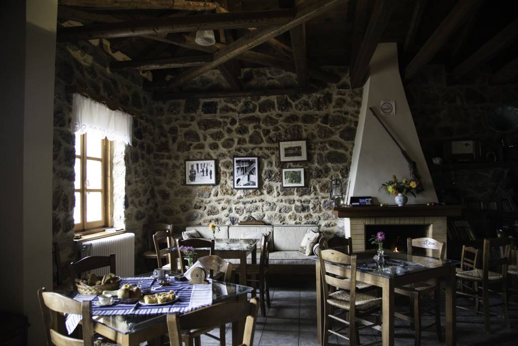 Στον χώρο του πρωινού-καθιστικού σας περιμένουμε μπροστά στο τζάκι για να κουβεντιάσουμε μαζί σας για την περιοχή, να σας πληροφορήσουμε για τις μετακινήσεις σας, να σας κεράσουμε τσίπουρο και γλυκό του κουταλιού. Στον ίδιο χώρο με τις συλλογές παλιών αντικειμένων, θα σας προσφέρουμε σπιτικό πρωινό με χειροποίητα προϊόντα, και τα βράδια μπορείτε να χαλαρώσετε με ωραία μουσική.